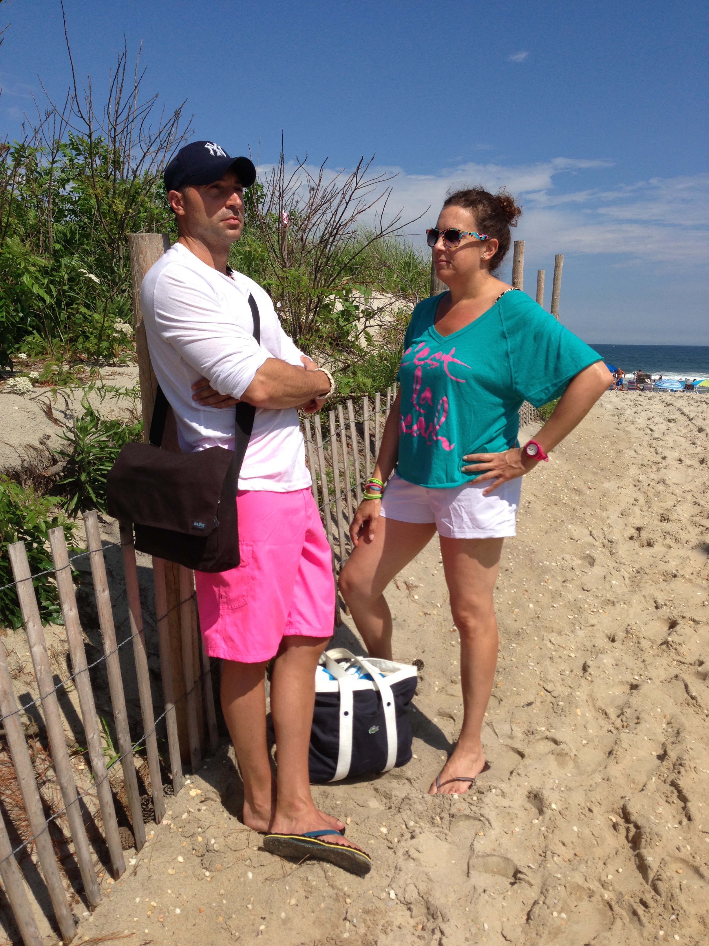 I am wearing my new top and board shorts from Ron Jon, flips from Havana, watch from Coach, and my bag is Lacoste.