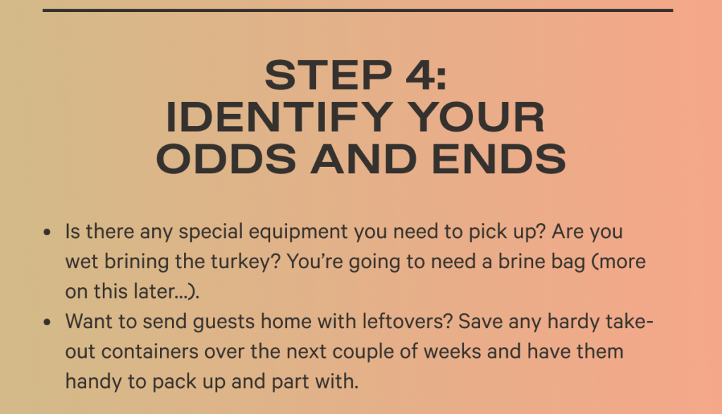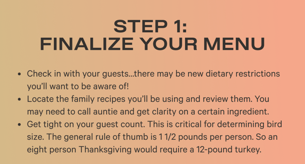 Option 1 -At home with home cooks – plan your menu, take out the decor (and buy more if necessary), order your turkey from a local vendor, create your shopping list, and start shopping.
