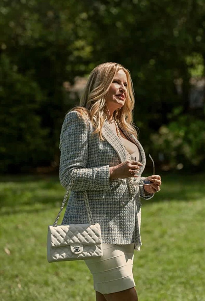 From Netflix (Tudum), ‘The Watcher’ Costume Designer Lou Eyrich on Those Chic Looks. “From Nora and Dean’s wardrobe of cashmere and silks in lush, dreamy neutrals to real estate agent Karen’s (Jennifer Coolidge) Chanel drip, the clothing in The Watcher is a subject all its own — one that complements the show’s themes of picture-perfect facades and what might lurk underneath.”
